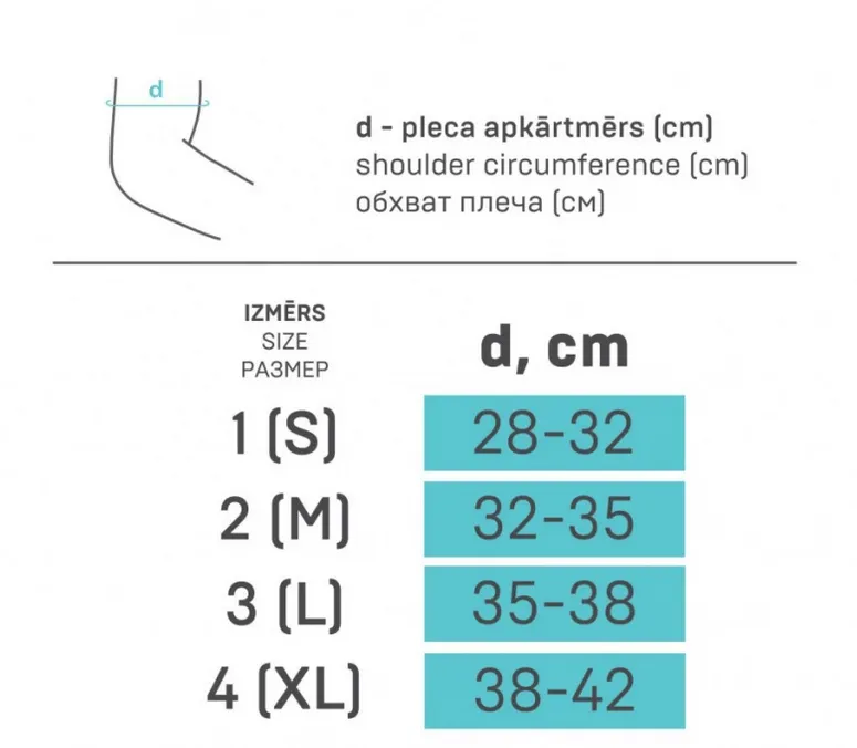 Повязка предназначена для использования в качестве лечебно-профилактического средства для фиксации плечевого сустава и дозированной компрессии мышц верхней трети плеча.