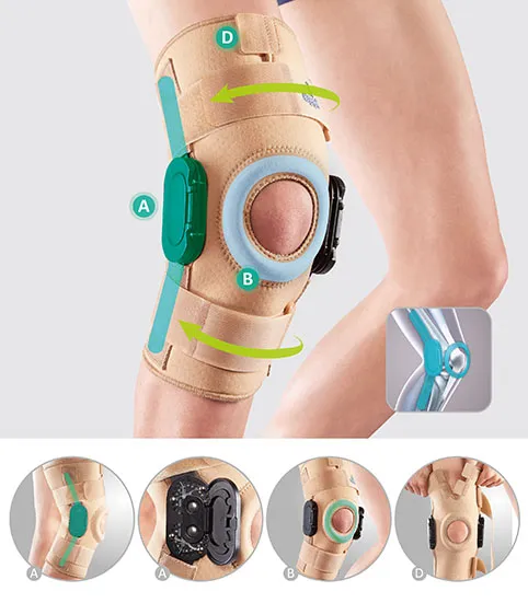 - При правильном расположении ортеза на ноге надпателярное отверстие должно находиться посередине коленной чашечки, а боковые шины строго по наружной и внутренней поверхностям коленного сустава. После надевания ортеза застегните все застежки и зафиксируйте ленты над и под коленной чашечкой.
