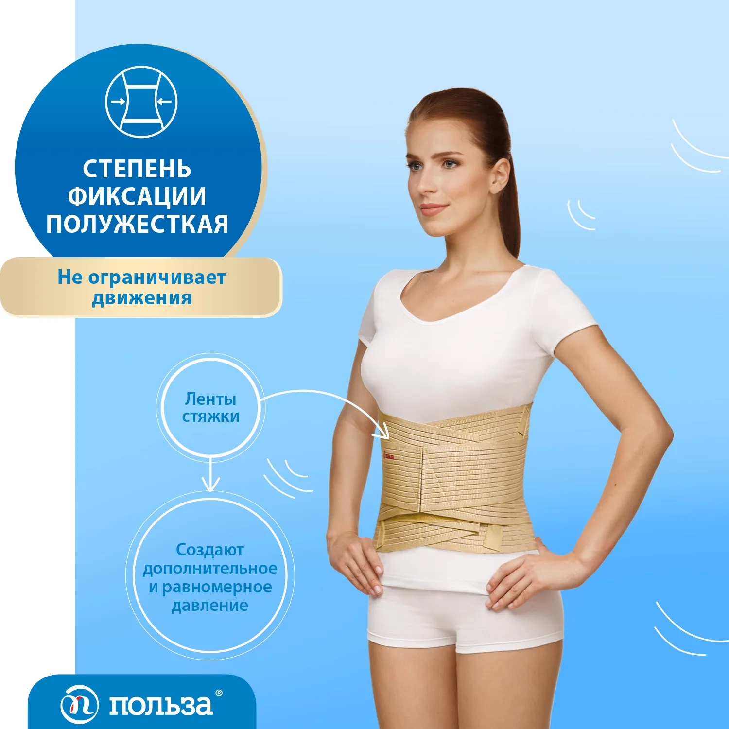 - дополнительные двойные ленты-"стяжки" из плотной эластичной ткани, растяжимой только в продольном направлении, способствуют равномерному распределению давления