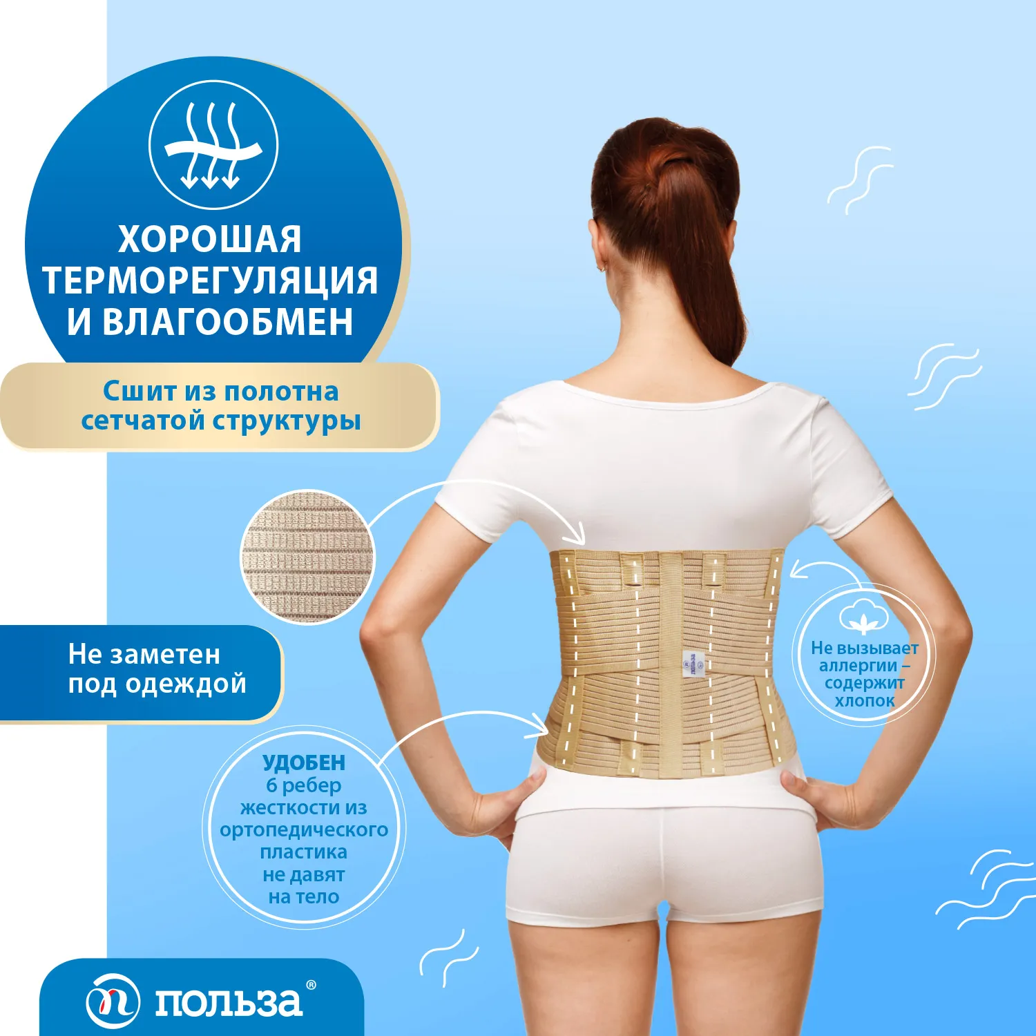 - обеспечивает умеренную фиксацию и разгрузку пояснично-крестцового отдела позвоночника