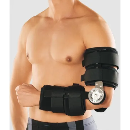 Ортез с ребрами жесткости и регулятором угла – это ортопедическое изделие, предназначенное для иммобилизации локтевого сустава, а также для установки ограничения угла его сгибания. Основой ортеза являются металлические шины с шарнирами с внутренней и внешней стороны локтевого сустава, с помощью которых происходит регулировка диапазона его разгибания.