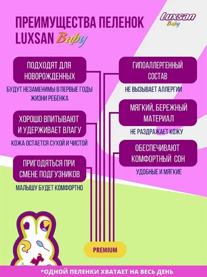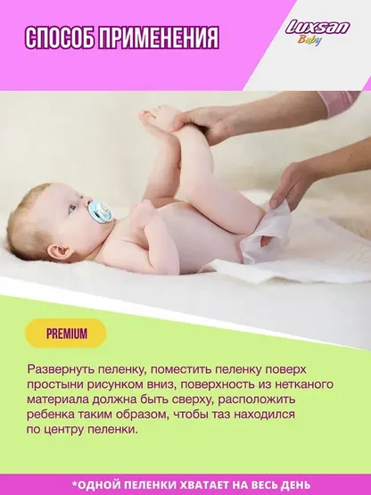 Детские впитывающие одноразовые пеленки "Premium" гарантируют гигиену и комфорт, благодаря своим характеристикам позволяют предотвратить раздражение кожи и обеспечить комфорт.