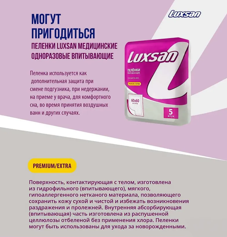 Пеленки впитывающие LUXSAN Premium/Extra купить по выгодной цене 0.00 руб. в наличии артикул .