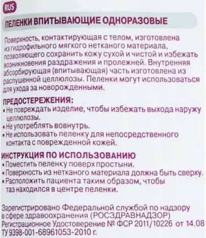 Поверхность, контактирующая с телом, изготовлена из гидрофильного мягкого нетканого материала, позволяющего сохранить кожу сухой и чистой и избежать возникновения раздражений и пролежней. Внутренняя абсорбирующая (впитывающая) часть изготовлена из распушенной целлюлозы.